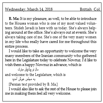 De même, les langues qui se lisent de droite à gauche, comme l’arabe, présentent des défis lorsqu’il s’agit de les intégrer à la transcription globale. Par exemple, en mars 2018, la députée Bowin Ma a prononcé une allocution en persan à l’occasion de la Norouz et nous a fourni le texte persan à insérer dans la transcription. Il s’agissait alors de savoir comment intégrer deux passages courts se lisant de droite à gauche dans le texte principal se lisant de gauche à droite. En fin de compte, il a été décidé de présenter le texte sur des lignes distinctes :