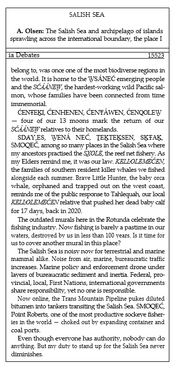 En raison de notre engagement à l’égard de l’exactitude, la recherche du bon texte peut prendre un certain temps. Dans l’intervalle, les réviseurs insèrent des commentaires éditoriaux génériques dans le texte. Une fois vérifiés, ces commentaires sont remplacés par le texte ou la bonne traduction. La Colombie-Britannique se distingue en publiant l’intégralité de la première version du compte rendu le jour même. Cette version est suivie d’une version révisée, puis du compte rendu officiel définitif. Ce délai de publication prolongé nous permet de prendre plus de temps pour chercher et trouver l’information pertinente. Ainsi, la mention [langue autre que l’anglais] peut figurer dans la première ébauche d’un discours, puis celle-ci, [en SENĆOŦEN], dans la version révisée et enfin cette dernière, [… en SĆÁÁNEW̱ [saumon] …], dans la version finale. Dans des circonstances particulières, si de l’information nous parvient après la publication du texte final, nous envisageons également d’effectuer des corrections après impression afin de garantir un compte rendu aussi complet et précis que possible. Plutôt que de traiter ces révisions comme des erreurs ou comme des lacunes dans notre processus de recherche et de révision, nous les considérons comme des occasions d’améliorer la qualité du produit final.