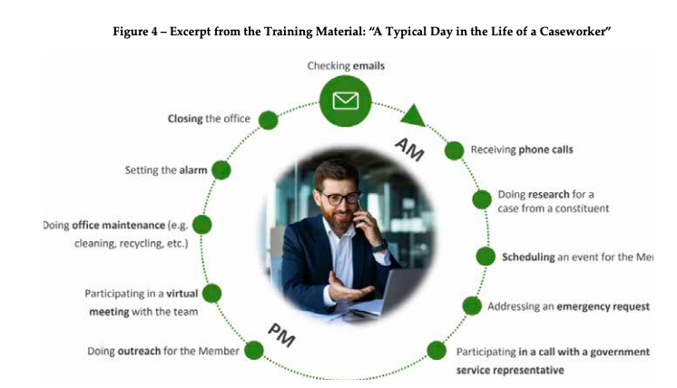 Cette dimension pédagogique comprend naturellement des illustrations qui aident à clarifier les concepts principaux. Par exemple, un membre du personnel d’une circonscription peut être amené à accomplir un large éventail de tâches tout au long de la journée. Un élément visuel comme une « horloge des activités » peut efficacement illustrer la diversité des rôles qu’il assume au-delà de sa description de poste officielle : ouvrir le bureau, organiser un événement local, ranger l’espace ou offrir une oreille patiente et empathique à un électeur frustré.