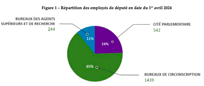 Aujourd’hui, l’afflux constant de nouveaux employés parlementaires représente environ 58 embauches par mois3. Chaque député est généralement appuyé par une équipe de six à huit employés qui l’assistent dans ses fonctions législatives, administratives et de représentation, tant à Ottawa que dans sa circonscription. En date du 21 avril 2025, 2 225 employés soutenaient les députés de la Chambre des communes partout au Canada, dont 65 % étaient situés à l’extérieur de la région de la capitale nationale (RCN).