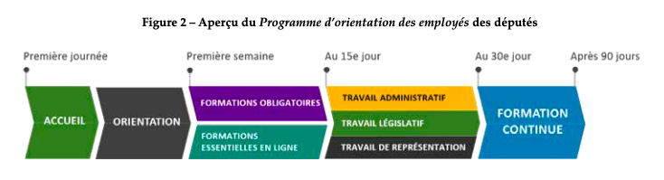 Le parcours d’apprentissage se poursuit ensuite avec l’intégration de cours obligatoires découlant du Code canadien du travail, une formation essentielle en sécurité et en technologie, puis d’autres sphères d’apprentissage axées sur les fonctions parlementaires : les volets administratif, législatif et de représentation.