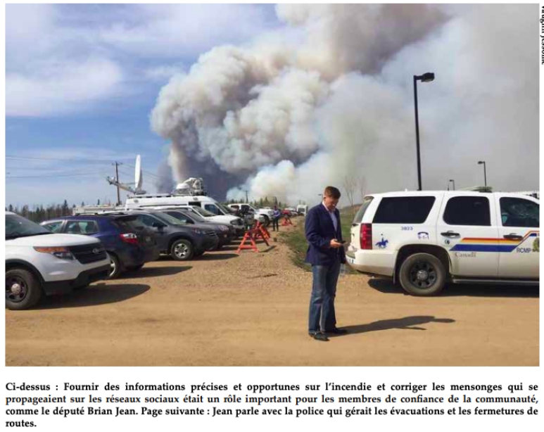 Entourée par la forêt boréale, la ville de Fort McMurray fait partie de la municipalité régionale de Wood Buffalo, dans le nord-est de l’Alberta. La région est représentée par deux députés de l’Assemblée législative de l’Alberta : Brian Jean, ministre de l’Énergie et des Minéraux et député de Fort McMurry-Lac La Biche, et Tany Yao, whip adjoint du gouvernement et député de Fort McMurray-Wood Buffalo. Au moment des feux de 2016, les deux hommes n’avaient été élus qu’un an auparavant. Ils travaillaient dans le même bureau et étaient tous deux soutenus par l’adjoint de circonscription Vaughn Jessome, qui allait bientôt faire l’expérience d’une évacuation dans ce qu’il a décrit comme une « expérience unique au cours de laquelle l’inconnu est la partie la plus difficile ».